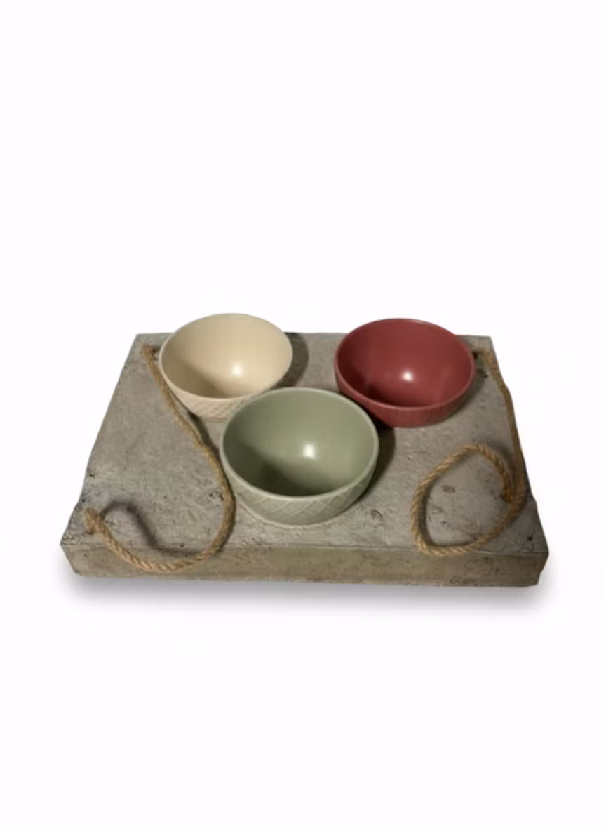 Det här får du: • Rustik bas: En rejäl platta i betong med en levande, rå struktur som ger karaktär åt varje dukning. • Detaljer med känsla: De dekorativa och praktiska rephandtagen förstärker den hantverksmässiga looken. • Färgstarka kontraster: Tre snygga skålar i harmoniska färger (krämvit, dovt grön och djupt hallonröd) som poppar vackert mot den ljusa basen.